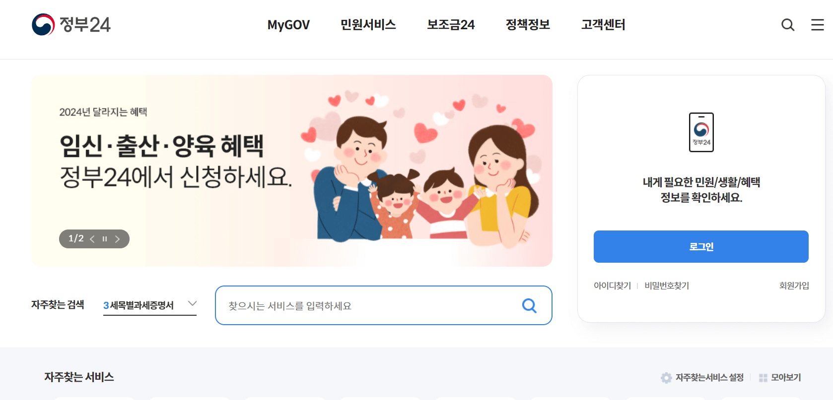 1) 정부24 홈페이지에 접속합니다.