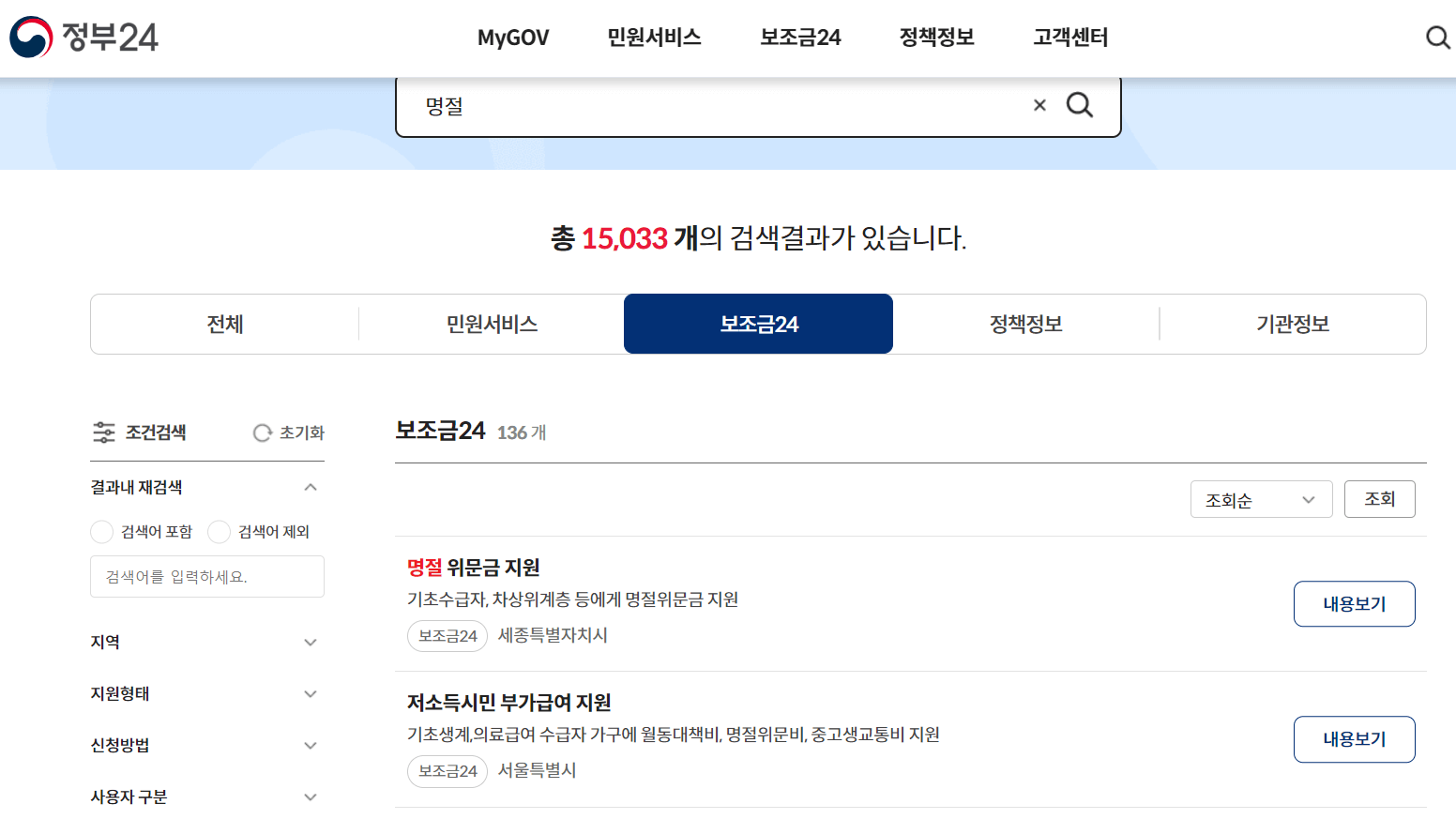 3) 명절을 검색한 뒤 보조금 24메뉴를 선택합니다.