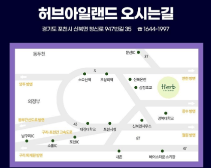 학담검문소를 지나 포천, 신북온천방향(368지방도)으로 좌회전하세요. 신북온천을 지나 포천방향을 4km 오시면 좌측으로 허브아일랜드가 있습니다.