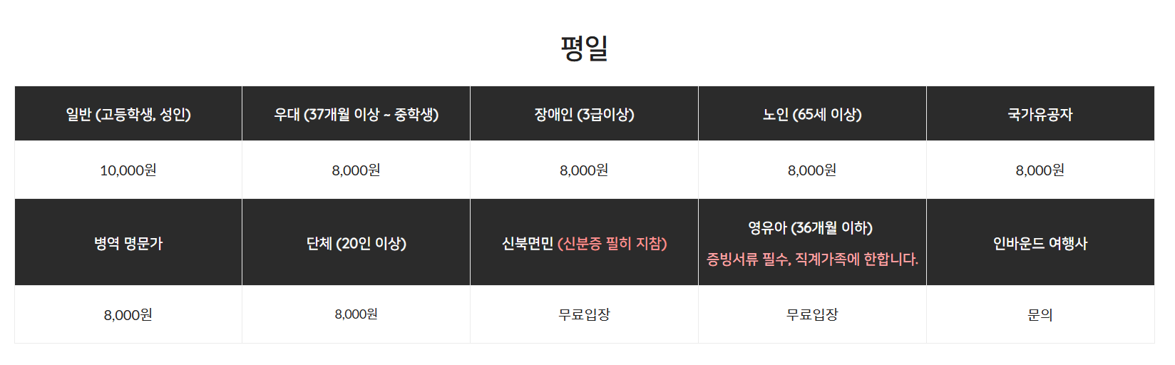 [평일] 일반: 10,000원 우대(37개월~중학생): 8,000원