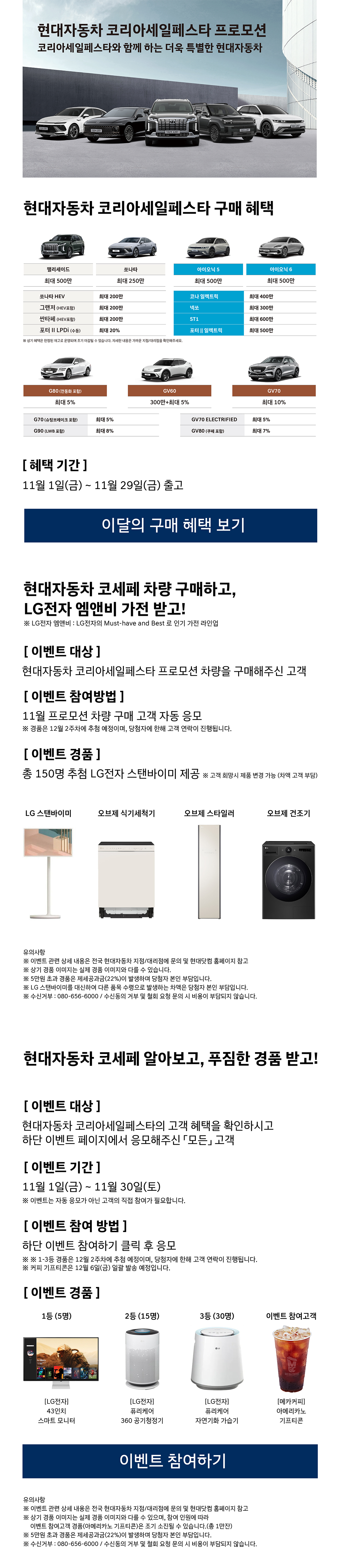 현대자동차는 이번 행사에서 차량 구매 고객을 대상으로 특별한 경품 이벤트를 진행합니다. 구매 고객 중 추첨을 통해 총 150명에게 LG 전자 제품을 경품으로 제공할 예정입니다.